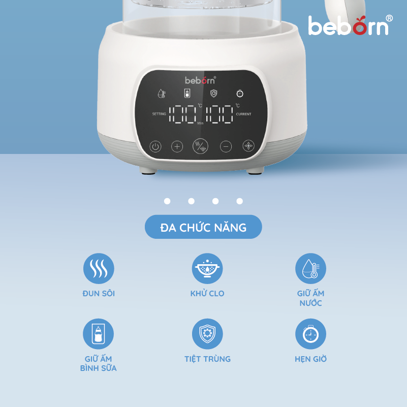 Một chiếc bình đun nước hoạt động chăm chỉ không quản ngày đêm, chính là Bình đun nước giữ nhiệt pha sữa điện tử K05. Là dòng máy tiêu chuẩn của Beborn, giá thành rẻ hơn nhưng vẫn đầy đủ các chức năng: Đun sôi, Khử clo, Giữ ấm. Ngoài ra K05 còn trang bị dụng cụ hâm sữa để mẹ không tiêu tốn thêm chi phí mua thêm một chiếc máy hâm sữa đơn. Thời gian giữ ấm liên tục lên tới 72 giờ, cùng với tính năng hẹn giờ tiện lợi sẽ giúp mẹ luôn có nước sử dụng khi cần.